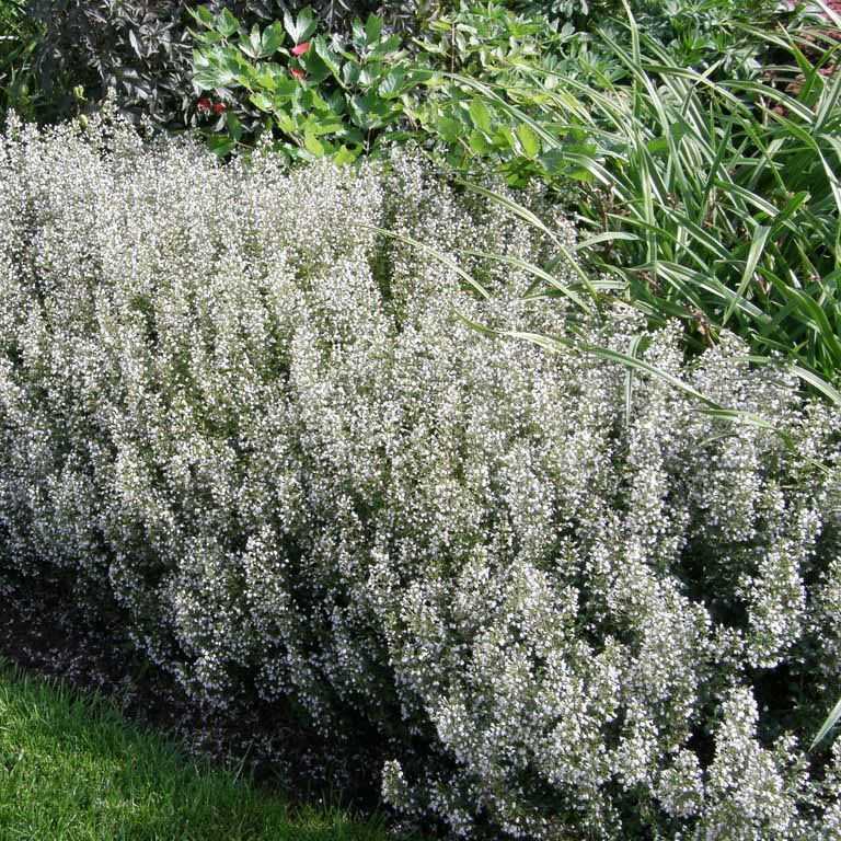A Calamintha nepeta ‘White Cloud’ egy dekoratív, aromás évelő cserje, amely fehér virágaival és illatos leveleivel nyűgözi le a kertbarátokat. Virágai nyár közepétől késő őszig folyamatosan nyílnak, sűrű, tiszta fehér virágpárnákat alkotva, amelyek finom kontrasztot teremtenek a sötétzöld lombozattal. Kompakt, bokros növekedésű, így ideális választás sziklakertekbe, évelőágyásokba vagy konténerekbe.