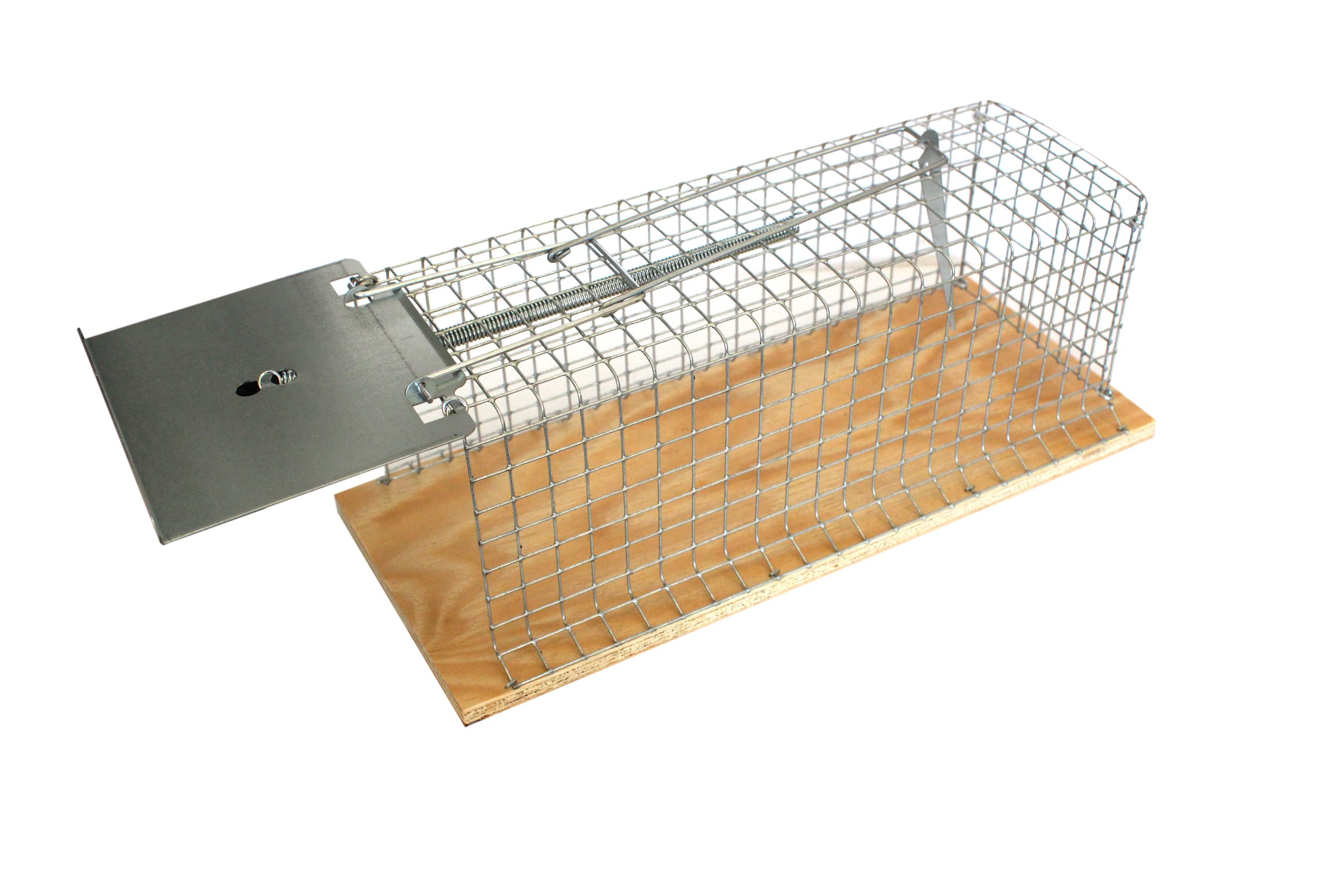 Műanyag alapú fém ketrec. A nyitott kalitkába a patkány bemászik a csalivéget, de ki nem tud kimászni, mivel a nyílás ajtaja a kioldóra helyezett csali mozgatásával bezáródik.