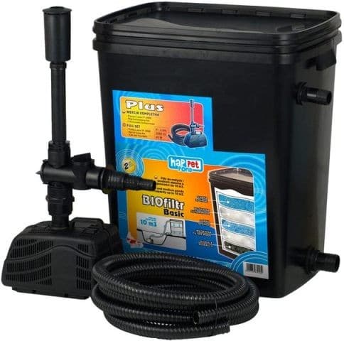 Happet BIOFiltr Basic kerti tó szűrő. Nagy kapacitású, doboz formájú átfolyó tószűrő. A tópartra helyezve hatékonyan szűri meg a vízpumpa által átfolyatott vizet. Egyszerű kialakítása miatt maximálisan kihasználja a szűrőanyagok kapacitását. Gyárilag benne foglalt szűrőanyagai hatékony mechanikai és biológiai szűrést végeznek. Könnyen tisztítható, és a szűrőanyagokat is igény szerint variálhatjuk. A csomagban szűrőszivacs, filtervatta, bio-labda is található, valamint 4 m gégecső. 33 literes szűrőkapacitását maximum 10000 literes tómederhez ajánljuk.A vízpumpa teljesítménye 2000l/h , fogyasztása 35W. Csak rendelésre!
