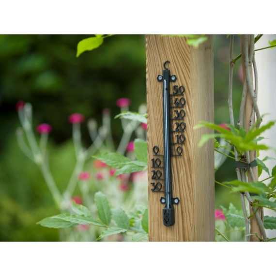 Fekete, epoxi fémből készült, falra szerelhető, profilozott kültéri hőmérő.