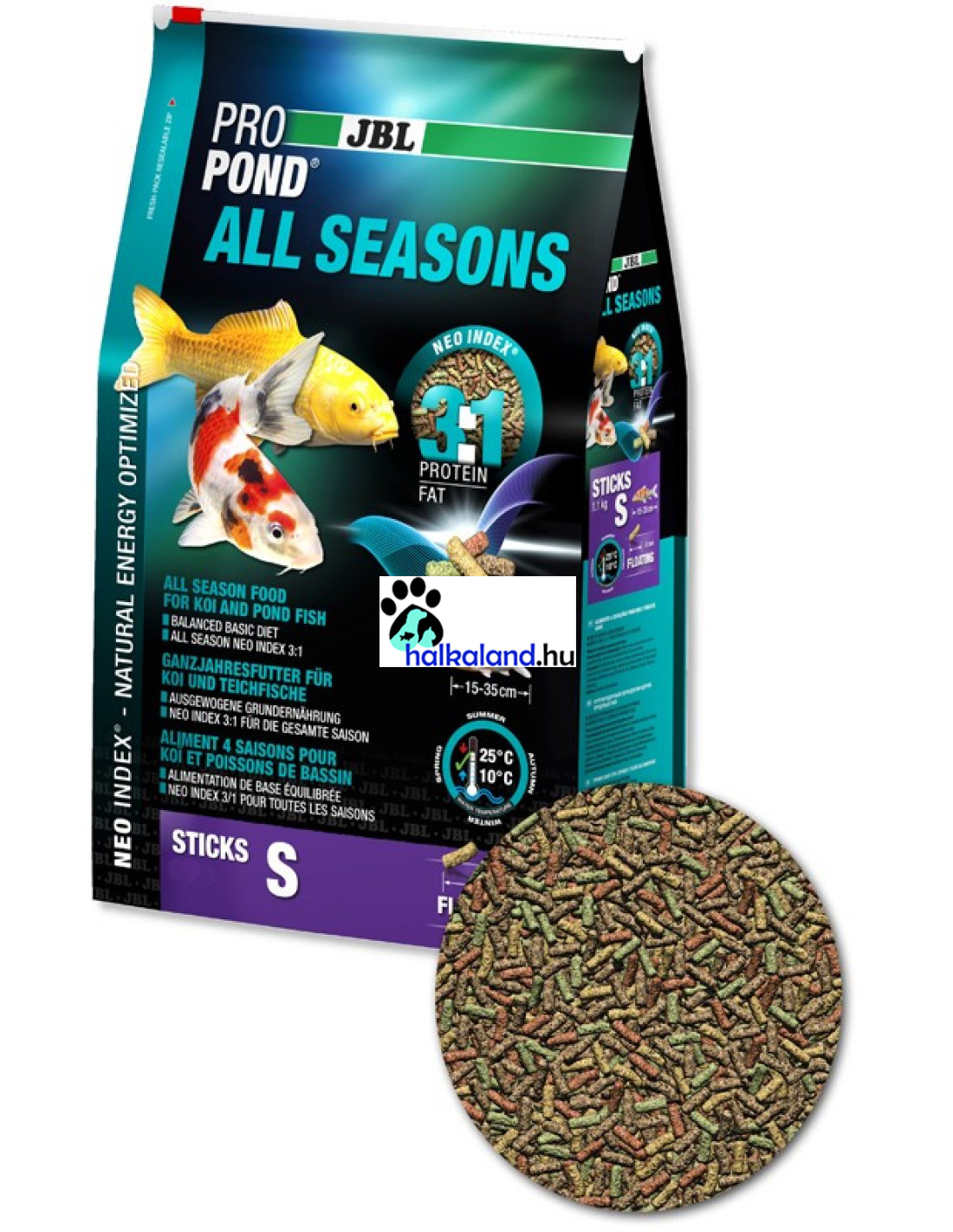 JBL ProPond All Seasons kerti tavi díszhaleleség. Teljes értékű táp megfelelő fejérje/zsír aránnyal (3:1). Tavi halainkat élénk színűvé és egészségessé teszi. Lazacot, spenótot és spirulinát tartalmaz. Az év bármely szakaszában etethetjük vele halainkat. A lebegő eleség szemcsemérete 8mm, amit ideális a 15-35cm közötti méretű díszhalak számára. Kiszerelése 32 liter (5.8kg), visszazárható tasakban.