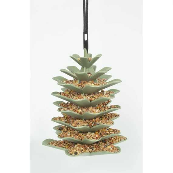 Dekoratív toboz formájú szemes takarmány adagolására alkalmas madáretető