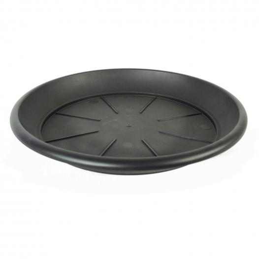 Fekete, polipropilénből készült virágcserép-alátét az egyszerű öntözéshez.Az alátét sugár irányban bordázott, a jobb szellőzés érdekében.