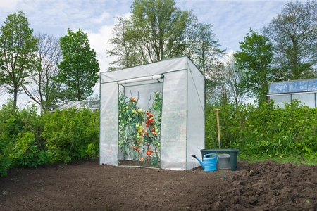 Paradicsom üvegház epoxi bevonatú fémvázzal (Ø 18 mm). A burkolat UV-álló, megerősített polietilénből készült, és cipzárral, az üvegház rögzítéséhez vezető kötéllel és 3 ablakkal van felszerelve az optimális szellőzés érdekében. A fóliás üvegház egyfajta üvegházként is funkcionál a paradicsomnövények számára: ellenállnak a különféle időjárási viszonyoknak, és kellemes klímában virágozhatnak. Természetesen ezt az üvegházat más növények termesztésére is használhatja, mint például paprika és padlizsán.