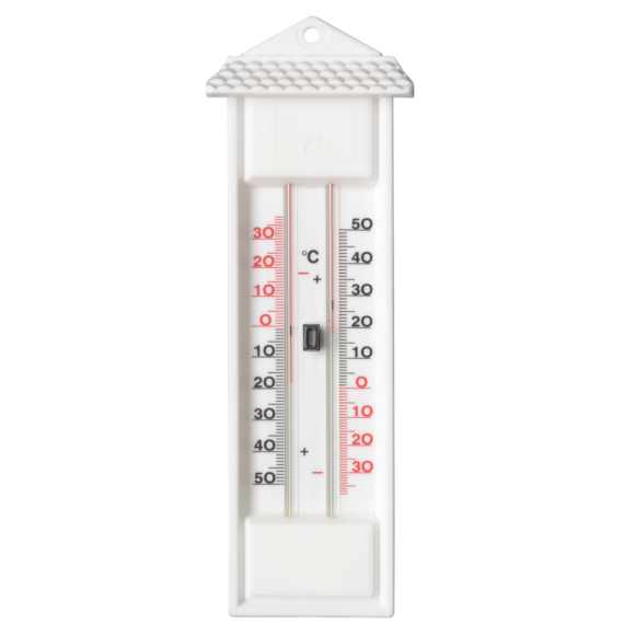 Falra szerelhető,műanyag, fehér, alkoholalapú folyadékkal. Jelzi a környezeti hőmérsékletet és megjegyzi a minimális és maximális hőmérsékletet is. Nyomógombbal rendelkezik a visszaállításhoz nullára.