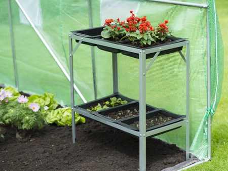 A Nature acél virágasztal kiválóan alkalmas otthoni használatra, teraszon vagy üvegházban. Az edényasztal horganyzott acélból készült, 2 szintes és 6 tárolóedény ( méretei: 7 x 38 x 24 cm).